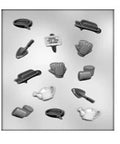 Each piece ranges from 3.8 cm x 2.5 cm x 0.6 cm to 5.1 cm x 2.5 cm x 0.6 cm. 13 cavities per mould. This mould makes approximately 90 pieces per 500 g of chocolate. This mould is not used for candy centres. Suitable for chocolate, soap making, plaster