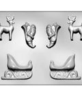 Sleigh 12.5 cm x 6 cm x 7.5 cm, Santa 6 cm x 8 cm x 4 cm, Reindeer 6 cm x 8 cm x 2.5 cm.6 cavities per mould.This mould makes approximately 1 piece per 500 g of chocolat