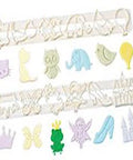 Whether you want to decorate a child's cake yourself using these very on trend cutters or you want to let the kids decorate the cake for themselves - this set of tappits will do the job! Consisting of 12 motifs on two tappit strips. The motifs are fairy, crown, castle, Cinderella shoe,frog,owl,bird,ballon,elephant, butterfly, cat and a cats head.