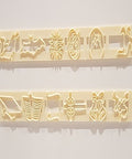This special occasions cutter consists of a mortar board, sun, book, pumpkin,bells, Celtic cross, moon, cupid, witch, ghost, bat and scroll.