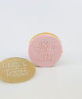 Cookie Debosser HUGS & KISSES is made of premium acrylic. Writing measures 5cm across and 4.5cm high. Size of cookie in picture is 8cm.